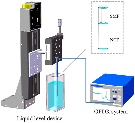 Figure 4 shows the experimental setup used for liquid-level sensing. The homemade OFDR system [27] was connected with the liquid-level sensor. An NCF with a diameter of 125 µm was mounted on the electric lifting platform with a step resolution of 1 µm, and the electric lifting platform enabled the optical fiber to be slowly inserted into the oil. The sensing fiber is tensioned to be straightened and suspended from the glass plate so as to vertically immerse it into the oil. Since the refractive indices of oils are very similar, and they are basically slightly larger than the refractive index of the optical fiber (n(SiO2) = 1.449), this paper uses stable and easily accessible glycerin (n(glycerin) = 1.473) for the experiment. In these experiments, the tunable light source is a Luna laser (Phoenix 1400) with a wavelength sweeping range from 1515 to 1565 nm. The laser scanning speed is set to 100 nm/s, the sampling rate of the DAQ is 80 MHz, the acquisition time is 0.4096 s, and the corresponding laser sweep range is 40.96 nm. Hence, the spatial resolution of the OFDR system is 20 μm according to Equation (4). Since the OFDR system has the characteristics of high spatial resolution and real-time monitoring, the liquid level can be reflected in the distance domain of OFDR, so the OFDR system can be used to achieve high-precision, real-time monitoring of the liquid level.