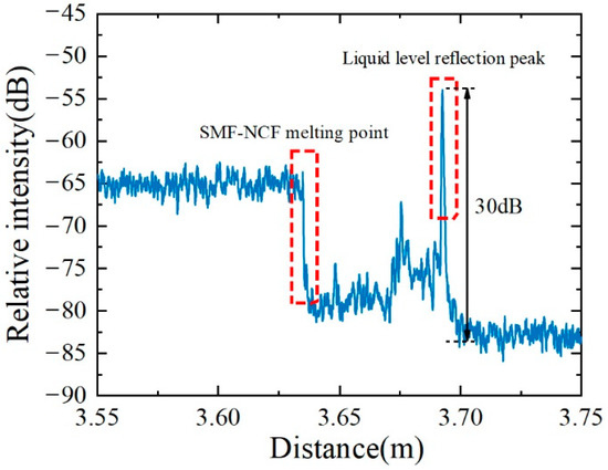 where n1 is the refractive index of air, n2 is the refractive index of oil, and R is the Fresnel reflection coefficient. Since the Fresnel reflected light intensity is much greater than Rayleigh scattering, a strong reflection spike appears in the range domain. In order to capture the strong reflection at the oil–air interface, we employed an OFDR system to measure the distributed reflection along the SMF and the NCF. As the liquid level changes, the reflection peak drifts in the distance domain, and the liquid level can be accurately ascertained according to the position of the reflection peak.