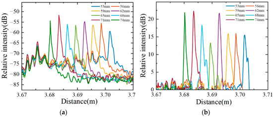 Figure 6 shows the drift of the reflectance peaks with the change of liquid level at every 3 mm distance in the liquid level range from 53 to 74 mm. As shown in Figure 5, some spurious peaks will appear at specific positions in the distance domain each time. It is interesting to find that these spurious peaks are stable in the air and located at fixed positions. Once the liquid level reaches the position of spurious peaks, these spurious peaks will be submerged in the strong reflected signal. Due to the stability of the spurious peaks, these spurious peaks can be effectively removed by subtracting the initial scattering signal from the measured scattering signal. Figure 6a is the distance domain drift before removing spurious peaks, and Figure 6b is the distance domain drift after removing spurious peaks. It can be seen that the reflection peaks in the distance domain also show uniform changes with the uniform change of the liquid level.