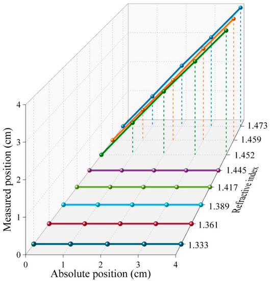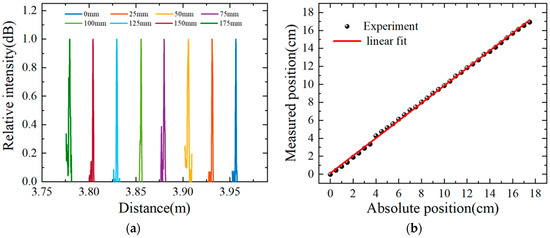 Figure 8a shows the reflection peak shift for the 175 mm sensing range with a 5 mm step, and the reflection peaks are normalized and smoothed. It can be seen that the reflection peak is very distinct and changes uniformly with the increase in the liquid level. The peak value of the reflection peak on the distance domain with an interval of 5 mm is extracted as the liquid level (measuring distance), and the measurement position and the absolute position (step distance controlled by the electric lift) are linearly fitted. The result is shown in Figure 8b, the slope of the fitting curve is 0.9739, and the R2 value is 99.92%, indicating that there is a high degree of linear relationship between the measured position and the absolute position. It is verified that the sensor has a wide range of liquid-level measurements up to 175 mm.