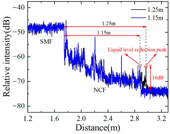 Considering the attenuation of the NCF, the large reflection peak at the oil–air interface is expected to be reduced when extending the NCF sensing length. Therefore, we fabricated another sensing sample with an NCF length of 1.25 m. Figure 9 shows the reflection intensity of the sensing probe in the distance domain. The titled curve reveals the large attenuation of the NCF. Compared with the sensing length of 175 mm, the reflected signal at the oil–air interface is significantly reduced but still has an SNR of 10 dB. When the liquid level is increased by 10 cm, the reflected signal at the end moves 10 cm to a short distance and maintains an SNR of 10 dB. Such an SNR is good enough to show the liquid level position. In conclusion, we obtained a sensing length of 175 mm with an SNR of 30 dB and a sensing length of 1.25 m with an SNR of 10 dB.