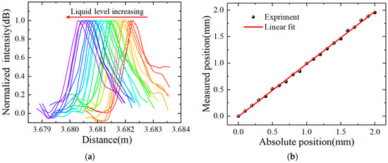 In order to verify that the sensor has the advantages of high resolution at the same time, the following experiments are designed on the same fiber. As shown in Figure 10, the electric control of the electric lift enables the optical fiber to be inserted into the liquid containing glycerin with a step distance of 0.1 mm, with a total distance of 2 mm. Figure 10a shows that the distance domain reflectance peak of OFDR changes uniformly with the increase in the liquid level. In order to better reflect the change process, the distance domain reflection peaks in Figure 10a are obtained after normalization and smoothing.