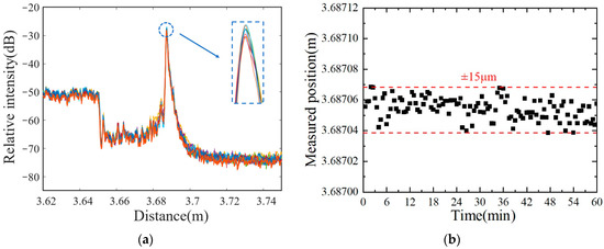 Stability experiment of the liquid-level sensor. (a) Typical reflection signals in the distance domain; (b) reflection positions collected every 30 s for 60 min.