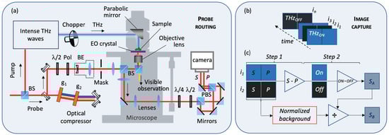 The system used in this experiment was first reported over ten years ago [12]. Set around an intense THz pulsed source with a center frequency of about 0.7 THz [17], as illustrated in Figure 1a, the observation unit was coupled to a visible optical microscope (model FV1000 from Olympus) that easily allows changes of objective lenses. 1920 × 1080-pixel images with 16-bit resolution are captured at 50 frames per second (fps) from an sCMOS camera (model Edge 5.5 from PCO). The capture was synchronized with the laser repetition rate and the mechanical chopper to provide dynamic background subtraction [11] from an alternative sequence of THzON/THzOFF images, as depicted in Figure 1b. The camera has a special trigger function known as the global shutter mode, which reads the data for all pixels in parallel. As shown on the right side of Figure 1a, the probe optical beam was split into two parts on the camera to simultaneously record horizontally (P) and vertically (S) polarized images. As detailed previously [12] and illustrated in Figure 1b,c, the typical measurement is performed in two steps: first, there is the subtraction between the corresponding pixels of the S and P polarized images that have been spatially separated on the camera, followed by a background subtraction from the next image capture (i.e., when the mechanical chopper blocks the THz signal). The result of this operation corresponds to the block SA in Figure 1c.