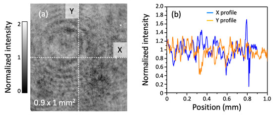 In Figure 2a, we show a typical 2D map of a background frame information captured with a 5× objective lens. This 2D map was normalized by the mean value of all pixels included in that image. For a perfect hat-shaped image, a flat profile centered around 1 should be obtained. However, after taking two profiles extracted in the horizontal and vertical directions, as shown respectively by the blue and orange curves in Figure 2b, significant variations of the probe beam could be observed, with some pixels exceeding 70% of the normalized value. As previously described, the origin of the fringe patterns comes from the diffraction caused by each of the dust particles encountered in the probe’s path. The size and superposition of these fringe patterns depend respectively on the distance between the dust and the image plane of the camera, and their position on the optical beam.