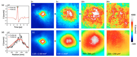 Figure 3 presents a comparison of THz imaging using standard dynamic background subtraction versus dynamic background subtraction, followed by a probe power normalization frame Nbck, which corresponds to a comparison between cases SA and SB in Figure 1c, respectively. The experimental THz pulse used in this experiment is shown in Figure 3a. The yellow dot in this figure represents the position of the peak electric field where each THz image was studied in the following demonstrations. Figure 3b,c show the comparative temporal maps at the peak position of the THz electric field without and with probe power normalization, respectively. The four maps in these two sets of figures represent the imaging results using four objectives, 2×, 5×, 10×, and 20×, respectively. From these maps, it is evident that the probe power normalization of the THz image works and completely eliminates speckle-like variation at all magnification conditions. This is even more significant for higher magnification factors, such as 10× and 20×, where small dust particles produce larger probe modulations. To better appreciate this correction, Figure 3d shows the extraction of the beam time profiles using a 5× objective without (black) and with (red) probe power normalization at the positions between the arrows in Figure 3b,c, respectively. Clearly, the recovery of a Gaussian beam profile is achieved with a single pixel line extracted in these images and without any notable increase in noise.