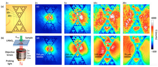 To demonstrate the usefulness of our proposed method, we show the THz imaging evaluation of a fractal sample; see the visible structure in Figure 4a. The sample is patterned directly on the LN sensor, as shown in Figure 4b, and reported previously [13]. Each magnification area visualized by the different objectives is represented by the grey dotted boxes in Figure 4a. It is important to mention the value of using a higher magnification factor, which does not necessarily improve the spatial resolution, but rather, the sensitivity of the measurement. Basically, a higher magnification increases the number of pixels per unit area, but at the cost of a smaller field of view. For example, the 2× lens produces images with a 2.25 × 2.5 mm2 field of view for 834 × 960 pixels, which gives 2.7 μm/pixel, whereas a 20× lens gives 0.27 μm/pixel in an area of 225 × 250 μm2. As this system is mainly limited in resolution by the condition of the probing light and the thickness of the EO crystal [13], i.e., around 20 μm for this demonstration, the additional pixels can be used to perform spatial binning [20].