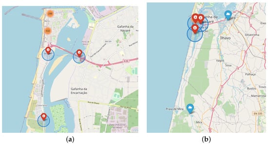 Figure 1a presents the localization of the radars named “pasmoradar03pontepraias”, “pasmoradar02poste12” and “pasmoradar01riativa”. The first one occurs before entering the bridge; the second one is in the interconnection segment between Barra and Costa Nova, and the third one is at the urban limit to the south of Costa Nova.