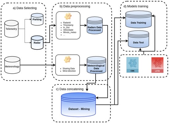 Finally, during the model training phase (Figure 2d), the data were processed by the data mining techniques, producing the models throughout LSTM and CNN.