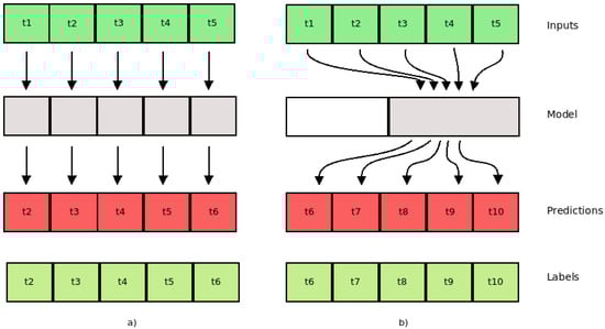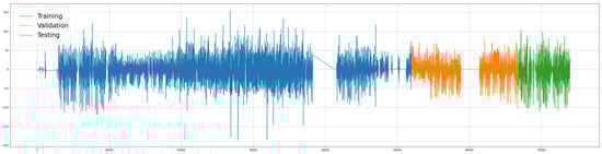The dataset was not randomly shuffled before splitting. The final dataset that was preprocessed in the previous steps was divided into training, validation, and testing sets, composed of 70, 20, and 10% of time-ordered records. The time ordering is necessary to build windows of consecutive records, and it is a way to execute training, evaluation, and testing steps more realistically due to the time series form of the data. In addition to the radar information, the dataset contains contextual data []: weekday, temperature, solar radiation, speed and wind direction, and precipitation. These attributes can improve the performance of the predictive models; however, they are related to the year’s seasons. Therefore, to ensure that the model considers records of all seasons, the training set was defined with 70% of the dataset; it is equivalent to the interval between January and December of 2020.