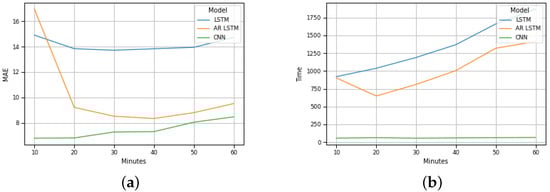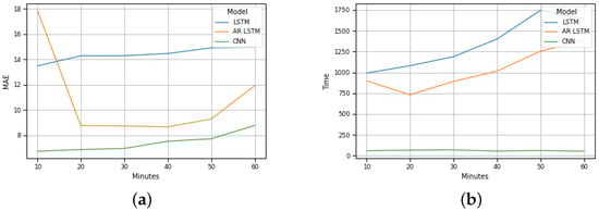 Figure 6b plots the test results for Barra traffic. By analyzing it, we can conclude that, for Barra beach, if the input and output intervals increase, the MAE of the LSTM method remains constant, the MAE of the AR-LSTM method decreases between twenty and forty minutes (increases between forty minutes and sixty minutes) and the MAE of the CNN method increases. Furthermore, it is also possible to conclude that if the input and output intervals increase, the execution time of the LSTM and AR-LSTM methods increases, and the execution time of the CNN method remains constant.