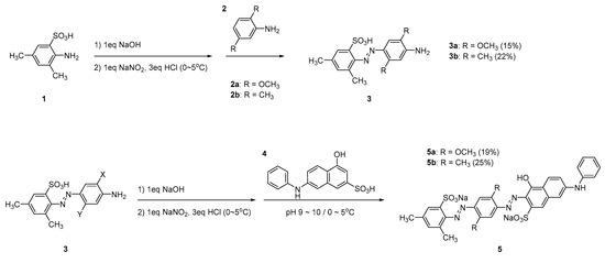 The synthetic procedure of DMx (5a) and DM (5b) is shown in Figure 2. Both dyes were synthesized in two diazotization steps. In the first diazotization step, to substitute a sulfonic acid group to sodium sulfonate in the 2-amino-3,5-dimethylbenzenesulfonic acid (1), the 2-amino-3,5-dimethylbenzenesulfonic acid (1, 0.01 mol) was dissolved in an aqueous solution of sodium hydroxide (0.01 mol, 30 mL) and stirred at room temperature for 30 min and then sodium nitrite (0.01 mol) aqueous solution (5 mL) was added. The mixture was placed in an ice-water bath and the temperature was lowered to 0~5 °C. A hydrochloric acid (0.03 mol) aqueous solution was slowly added into the solution while maintaining the temperature at 0~5 °C and stirred for 1 h. As the diazonium reaction proceeded, the mixture solution turned into a yellowish opaque solution. After the diazonium reaction, the reactant was slowly added to 2,5-dimethoxyaniline (2a, 0.01 mol) as the first coupler dissolved in acetic acid (3 mL) while maintaining 0~5 °C. As the reactants underwent an azo coupling reaction, the color of the solution turned red. After stirring for an hour, the product was filtered and washed with deionized water several times. The product was dissolved in methanol (500 mL) and impurities were filtered out that were not dissolved in methanol. Then, the methanol within the product was partially evaporated to obtain a saturated solution, and an excess of water (500 mL) was poured to precipitate a monoazo compound (3a, yield: 15.3%) and dried under vacuum.