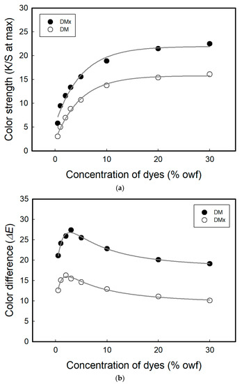 Color strengths at λmax (a) and color differences (ΔE) in cellulosic fabrics dyed with DMx and DM before and after exposure to DMAc (b).