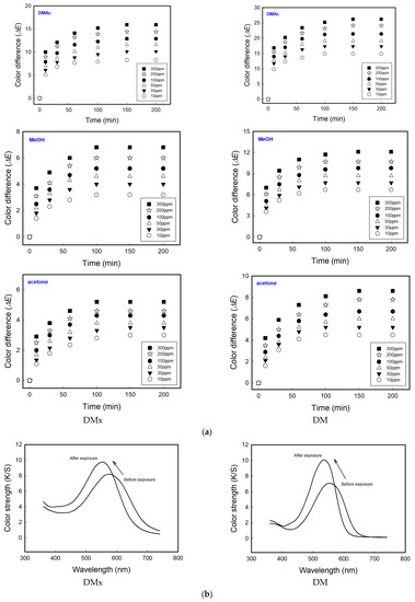Among the nine solvents, three exhibiting a strong color change, namely, acetone, DMAc, and MeOH, were selected and to conduct quantitative experiments according to solvent concentrations (10~300 ppm) and exposure time (10~200 min). In order to evaporate completely in the vials, each test vial was heated up to 30 °C for acetone and MeOH, and 70 °C for DMAc. Although the test temperature was lower than their boiling points, it was enough to vaporize the 300 ppm of solvents. In Figure 5a, the color change increased with the increase in the concentration of the solvents and exposure time, and then reached equilibrium. There are several indicators of toxicology of solvents. In this study, the sensitivity and practicality of the sensors were investigated using the threshold limit value-time weighted average (TLV-TWA), which represents the maximum allowable exposure concentration during normal work, i.e., 8 h a day, 5 days a week [26,27,28]. The TLV-TWA of DMAc and MeOH were 10 ppm and 200 ppm, respectively, and the color differences were 7.7 and 5.4 for DMx and 13.6 and 9.9 for DM at the allowable exposure concentration within 1 h. Additionally, the TLV-TWA of acetone was 500 ppm; however, even at 300 ppm, the color difference value reached 4.6 and 7.3 in 1 h. Generally speaking, a color difference value of 1.0 or more is recognizable to the naked eye. This means that the dyes show strong sensing performance even inside a cellulose substrate under a very low concentration of solvents. Since the fabricated sensors of this study exhibited very high sensitivity even at a lower concentration than TLV-TWA, showing a color difference of much higher than 1.0, trace levels of solvent leakage can be detected and responded to instantly without an electronic device.