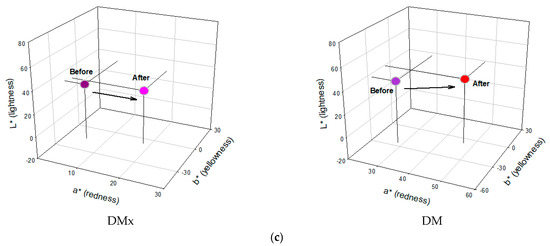 Figure 5b,c display the K/S spectral shift and change in L*, a*, and b* values when the textile-based sensors were exposed to DMAc, which caused the strongest color change. The K/S spectral shift of all nine solvents exhibited the same trend. Upon exposure to the solvents, a hypsochromic shift (DMx, from 580 nm to 550 nm; DM, from 550 nm to 540 nm) and a hyperchromic shift occurred. The L*, a*, and b* values for dyed fabrics with DMx were 31.22, 5.16, and −15.02 before exposure and 29.30, 18.23, and −6.10 after exposure. For DM, the values were from 37.03, 28.17, and −25.29 to 39.30, 46.66, and −6.80. This means that the textile-based sensors changed from bluish purple to reddish violet when exposed to solvents in the vapor phase.