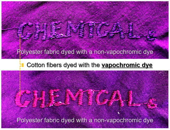 To visualize the performance of the textile-based vapor sensor, we dyed cotton filament yarn with synthesized vapochromic dye (DM) and then embroidered it as the lettering “CHEMICALs” on a sheet of polyester fabric dyed with a conventional non-vapochromic disperse dye of a similar color to the DM dye, as depicted in Figure 6. The textile-based sensor was placed into a closed acrylic box containing 200 ppm of DMAc vapor for 200 min, and the textile-based sensor displayed the lettering (CHEMICALs) by changing color.
