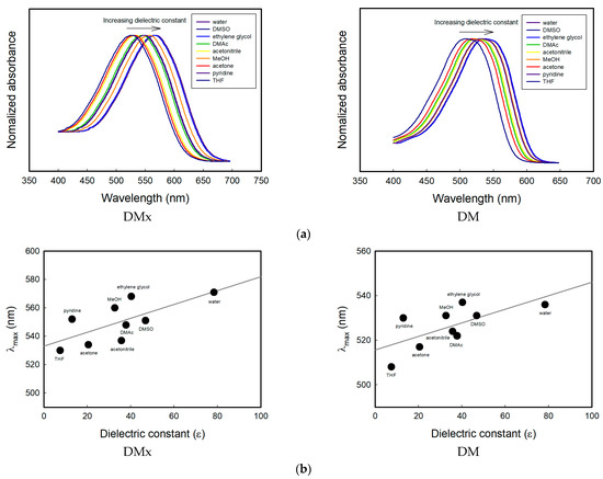 (a) Absorption spectra DMx and DM dissolved in various solvents with different dielectric constants, (b) relationship between the maximum absorption wavelength and solvent dielectric constant.