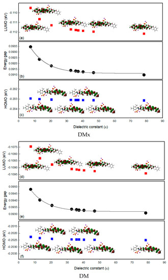 To observe the solvatochromic properties of the dyes from the molecular orbital energy point of view, a density functional theory (DFT) calculation was performed. After geometry optimization, the solvation effect was measured for the nine solvents used in the solvatochromism study. From the calculation, the Highest Occupied Molecular Orbital (HOMO) and Lowest Unoccupied Molecular Orbital (LUMO) energy was calculated and compared with the experimental results of the maximum absorption wavelengths of the dyes in each solvent. In Figure 8, the energy gap between the HOMO and LUMO of DMx and DM dyes became narrower as the dielectric constants increased. This is in good agreement with the fact that the maximum absorption wavelength of the dyes dissolved as the polar solvents shifted to a longer wavelength, as shown in Figure 7.