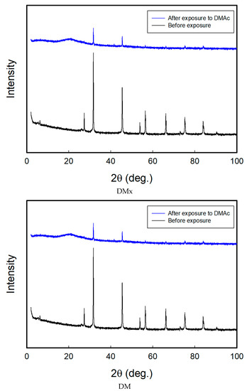 XRD patterns of DMx and DM before and after exposure to DMAc.