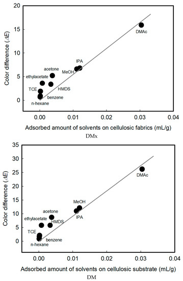 Relationship between the adsorption amounts of solvents on cellulosic fabrics and color difference before and after exposure to solvents.