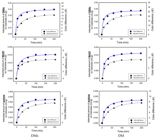 In Figure 11, the relationship between the rate of adsorption of solvents on cellulose fabrics and the color change under 300 ppm of DMAc, MeOH, and acetone is presented. The behavior of the solvents adsorption and color change is very similar. The adsorption amount for the solvents and the color difference of the textile vapor sensors were closely related.