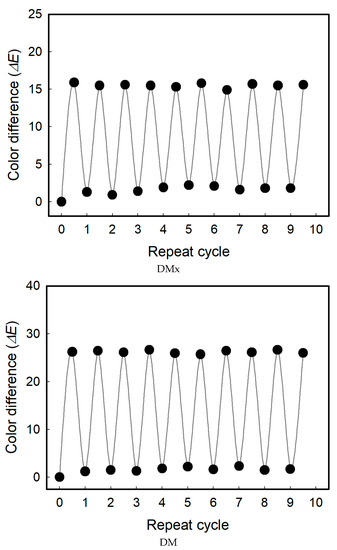 The repeatability of the textile vapor sensors was examined. One sensor was exposed to 300 ppm of DMAc at 70 °C for 200 min, and the color difference was measured before and after exposure, and then it was kept inside a vacuum chamber for 24 h to desorb the adsorbed DMAc molecules completely out of the sensor fabric. After that, the process of exposure to DMAc, and the measurement of color change and desorption were repeated for 10 cycles.