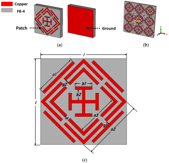 Patch design of the proposed MMA. (a) Perspective view, (b) simulation setup and (c) front view.