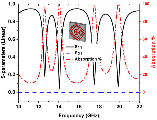 where S11 and S21 are reflection and transmission coefficients, respectively, as shown in Figure 2, and four near-zero reflection coefficient (S11) resonance peaks are achieved at 12.62 GHz, 14.12 GHz, 17.53 GHz, and 19.91 GHz. A copper ground of 0.035 mm thickness results in a zero transmission coefficient (S21), which can be obtained by calculation of the skin depth [27].