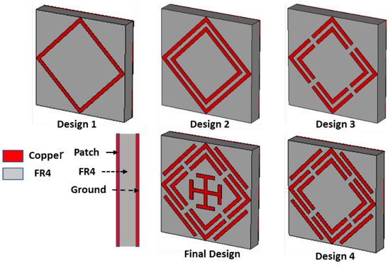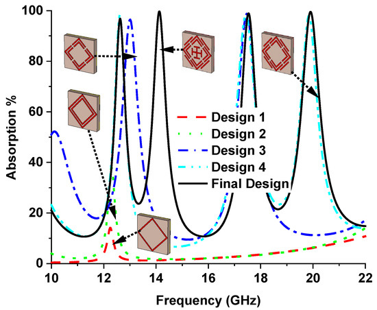 The evaluation of the proposed MMA towards SSRR for achieving quad-band absorption is shown in Figure 3. In order to understand the absorption mechanism of the MMA impedance, analysis is vital. The reflection coefficient (S11) depends considerably on the effective impedance , as shown in Equation (4).