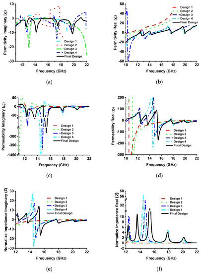(a) Imaginary permittivity, (b) real permittivity, (c) imaginary permeability, (d) real permeability, (e) imaginary normalized impedance, and (f) real normalized impedance for different MMA designs.