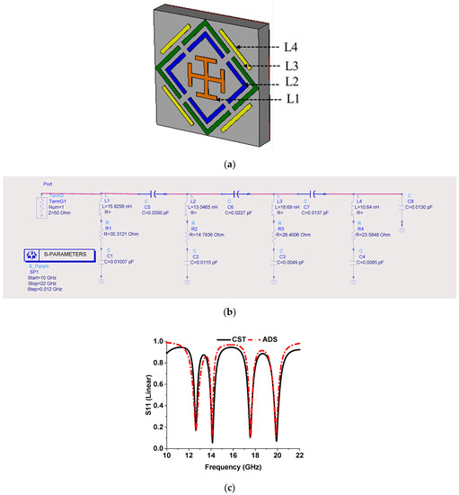 The proposed MMA equivalent circuit model was designed and simulated via ADS (advanced design system) [56], as shown in Figure 6 [27,57,58,59]. Each resonant peak is constituted by the inductance and capacitance of separate elements, such as the inner Jerusalem cross, the two splits ring, and the external microstrip line, indicated different colors in Figure 6a. An RLC circuit is considered for each resonant frequency in the equivalent circuit design shown in Figure 6b. The series capacitances, C1, C2, C3, and C4, are calculated by Equation (8), where the resonant frequency is f, and the associated series inductance is L (L1, L2, L3, and L4).