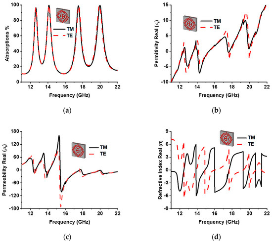 The peak 97% absorption at 12.62 GHz and 99% absorption at 14.12 GHz, 17.53 GHz, and 19.91 GHz were attained for the proposed MMA presented in Figure 2. The high-quality (Q) factor represents high sensitivity, where the Q factor is calculated by Q = fc/FWHM, where fC is the center frequency, and FWHM is the full wave of half maximum [51]. The Q factors of the proposed MMA at 12.62 GHz, 14.12 GHz, 17.53 GHz, and 19.91 GHz are 39.43, 34.43, 37.29, and 34.32, respectively.