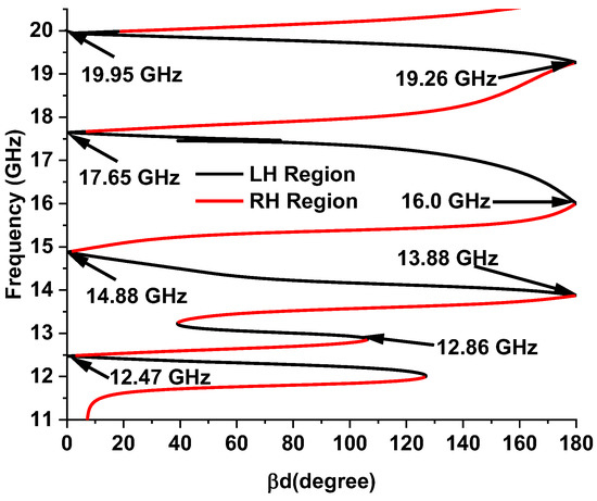 The designed MMA was simulated in both TE and TM modes. Unit cell boundary conditions were applied for TM and TE simulation. Figure 7a–d presents the absorption, permittivity, permeability, and refractive index plot for all three modes, which show a feature of uniform absorption behavior. Both modes obtain the near-uniform metamaterial properties. Table 3 shows the metamaterial properties of the proposed absorber at the resonant frequency. The DNG metamaterial property appears at 14.12 GHz, 17.53 GHz, and 19.91 GHz in TM propagation mode. However, at 12.62 GHz, SNG behavior is exhibited. The dispersion diagram also validates the metamaterial properties plotted by Equation (11) [24], where d is the MMA unit cell thickness and the propagation phase constant. Figure 8 presents the dispersion curve of the designed MMA during TM mode simulation. The positive slope of the curve represents the right-hand (R) region or SNG metamaterial. The phase and group velocity are parallel in the R region. The DNG metamaterial behavior is represented by the negative slope in the left-hand (L) region, where group velocity and phase are antiparallel. In TM mode, the upper three frequencies, 14.12 GHz, 17.53 GHz, and 19.91 GHz, are located in the L region, which represents double-negative metamaterial behavior. The SNG behavior of the lower 12.62 GHz frequency is understood from the right-hand R region. The similarity of these two methods validates the metamaterial behavior of the MMA.