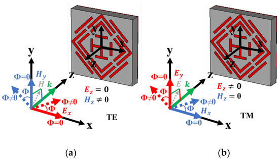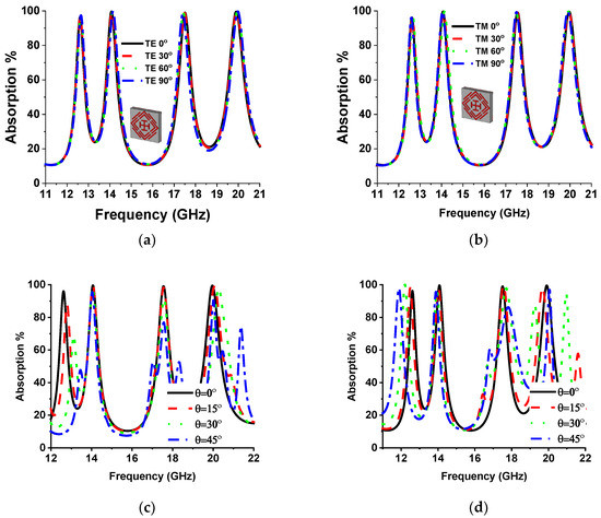 The H field () and E field () vector direction of the incident EM wave is presented in Figure 9a,b of the regular incident angle (θ = 0°) for TE and TM mode. The k vector towards the z-axis represents the propagation direction of the EM wave. In TE mode, there is no H vector in the z-axis, whereas no E vector exists in TM-mode propagation. Polarization-insensitive behavior of the proposed MMA for normal incident angle is plotted in Figure 10 for both TM and TE modes. The constant absorption plot for different polarization incident angles (0° to 90°) increases MMA eligibility for various applications. The reason behind the polarization-insensitive behavior is the symmetrical structural design of the proposed MMA. The designed SSRR is rotationally symmetrical, which indicates no effects on absorption at the rotation of incident EM wave vector on the XY-axis with respect to the Z-axis for circular or any other polarization of the incident wave, as shown in Figure 10a,b. Figure 10c,d shows the oblique incident angle impact TE and TM mode, respectively. In TE mode for the increment of the oblique incident angle, the absorption at 14.12 GHz shows stability up to 45°, but other resonances are either slightly shifted or reduced. On the other side, in TM mode, the absorption at both middle frequencies shows stability, whereas the upper and lower absorption peaks are shifted with the increment of oblique incident angle.