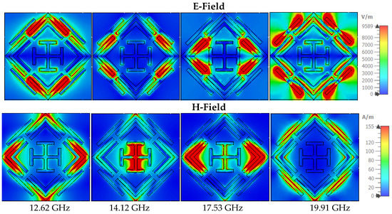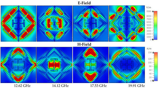The absorption mechanism can also be understood through (Magnetic field) H-field and (Electric field) E-field analysis [60]. The inter-relationship of these features can be assumed through the Maxwell equation [61,62,63]. The E-field is resonantly confined at a particular portion of the symmetrical structure. Figure 11 shows the E-field and H-field at in TE mode, where at 12.62 GHz frequency E-field is highly confined at the upper side of the external ring, and the strong H-field appears at the four corners of the outer ring. The intense magnetic field achieves absorption peaks at 14.12 GHz contributed by the vertical bar of the inner Jerusalem cross. On the other side, the E-field is strong in the left and right portions of the outer ring. The near-unity absorption at 17.53 GHz is contributed by the strong H-field of the right and left sides of the inner and outer ring, where less intensity appears in the E-field. The microstrip line on the outer ring’s external side influence the absorption peaks at 19.91 GHz. The two opposite sides of the microstrip line have an intense E-field, and the center shows high H-field intensity. Figure 12 shows the H-field and E-filed allocations in TM mode, where field intensity is similar to that in TM mode but rotated at 90 degrees.
