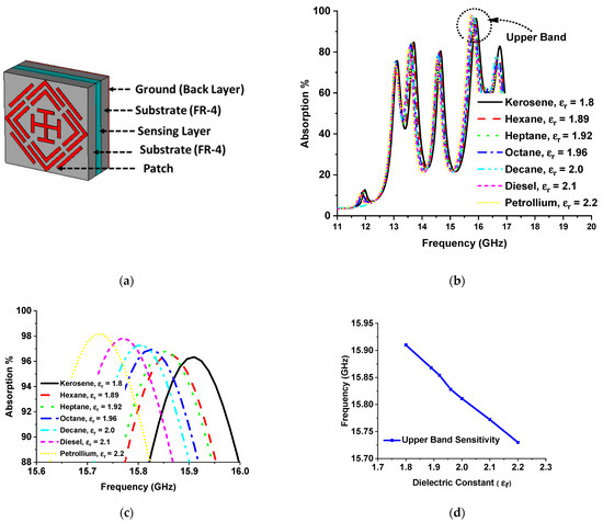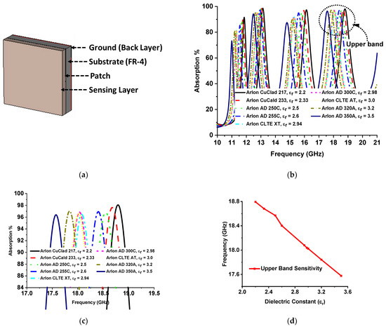 The absorption attributes of the designed MMA depend on impedance matching, which relies on the complex value of relative permittivity and permeability. The metamaterial property can be handled by variation of the substrate thickness and dielectric property. Hence, the absorption of MMA varies with substrate thickness and dielectric constant. MMAs can be used for sensing applications in two ways: by placing a sensor layer on top of the MMA patch [34] or by placing the sensing layer between the patch substrate and substrate ground [13,30,35]. Different mechanisms of absorption-based sensor applications have been proposed from microwave to THz frequency, such as permittivity sensors [32,33], refractive index sensors [34], grin sensors [35], density sensors, temperature sensors [30], glucose sensor [64], etc. A permittivity sensing model using the proposed MMA is presented in Figure 13a. The relation between the dielectric constant and permittivity can be understood according to the equation , where k is the dielectric constant, ɛ is permittivity, and is the permittivity of the vacuum. The dielectric constant is the ratio of how fast an electric field travels through a material compared to a vacuum medium. For the investigation of permittivity sensing, an air gap of 1 mm is maintained between two FR-4 substrate materials as a sensing layer. The patch was designed on the upper surface of FR4 substrate 1, and no copper layer was used on the lower side. On the other hand, no copper was used on the upper side of substrate material 2, and full copper was used on the bottom side. Different hydrocarbons with individual dielectric constants were inserted in the air gap in the range of 1.8 to 2.2. The absorption curve of the MMA changes due to the overall thickness and variation of different dielectric constants of hydrocarbon that used in the sensing layer. As a result, the absorption of the lower two bands and the one upper band out of the quad band decreases. Only one absorption band shows near-unity absorption. The absorption plots for different hydrocarbon materials are shown in Figure 13b. Figure 13 shows a zoomed-in version of the absorption peaks zooming in to facilitate understanding of the resonant frequency shift with respect to the dielectric constant. The resonant frequency shifts towards a lower-frequency region with the increment of the dielectric constant by a measurable frequency interval, as shown in Figure 13d. Another permittivity sensor model for solid material sensing is shown in Figure 14a, where the sensing layer is placed on the MMA patch. Various Arlon substrate materials were chosen, with dielectric constants between 2.2 and 3.5. The integration of the sensing layer with the MMA results in a change in peak absorption due to the overall thickness and dielectric constant variation of the MMA. These changes shift the resonance frequency of the MMA, as shown in Figure 14c. The Arlon solid material sensing sensitivity is presented in Figure 14d.