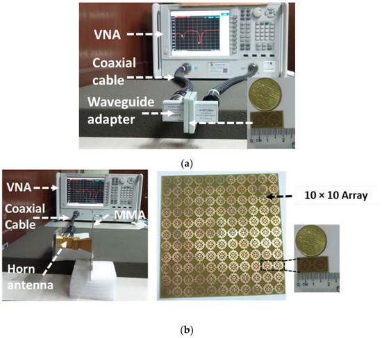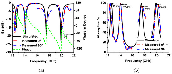 Figure 15 shows the measurement setup of the proposed MMA. The first three frequency bands were measured with the setup shown in Figure 15a. A vector network analyzer (VNA), coaxial cable, and waveguide to the coaxial adapter (P/N: 75WCAS, P/N: 51WCAS_Cu) and 1 × 2-unit cell prototype were used in this setup. The upper resonance frequency was measured by a horn antenna with 10 × 10-unit cells in the prototype design, as shown in Figure 15b. The agreement of the measurement and simulated values of the S11 (dB) phase in degree and absorption % are shown in Figure 16a,b, respectively. The measured absorption values are indicated in Figure 16b. The measured Q-factor is 28.83, 40.31, 13.91 and 25.76, at 12.4 GHz, 14.11 GHz, 17.56 GHz, and 20.1 GHz, respectively.