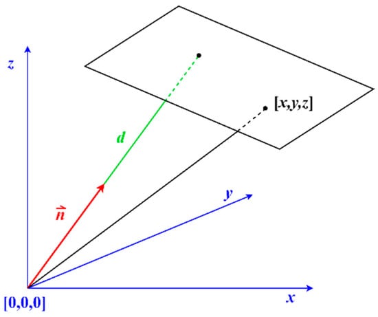 where , , and are components of the unit vector of the plane’s normal and is the distance of the plane from the coordinate origin in the direction of the normal. Figure 1 graphically illustrates the mathematical model of the plane (Equation (1)).