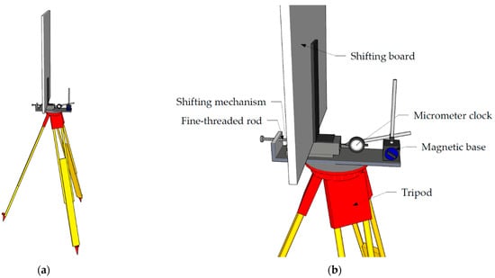For the shift test of the change detection in parameter , a wooden board of 100 cm × 60 cm was fixed vertically onto a fine-threaded mechanism attached to a surveying tripod (Figure 3). A Bahco micrometer with a magnetic base was also attached to measure the desired shifts.