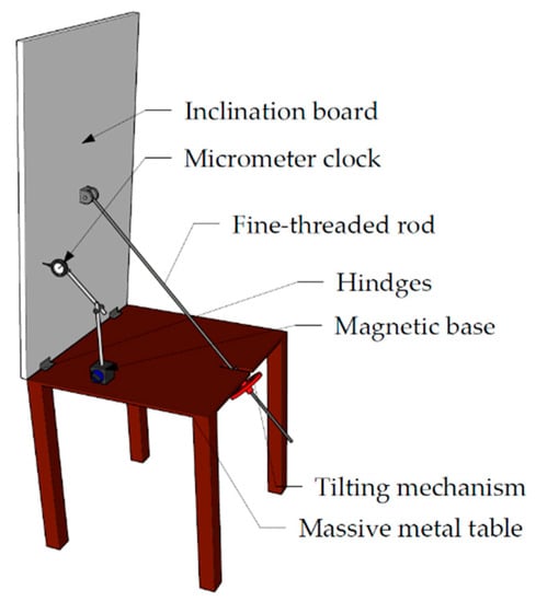 For the tilt test to detect changes in normal vector inclination, the same wooden board was attached to a massive metal tilting table (Figure 4) with hinges and supported by a fine-threaded rod that was rotatable using a mechanism on the table. This setup allowed us to tilt the plate in a controlled manner. The same Bahco micrometer with a magnetic base was attached to the table to allow precise board declination measurements. The measuring needle was set perpendicular to the board and the radius between the hinges and needle was measured to achieve the desired declination angles.