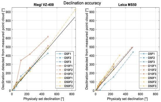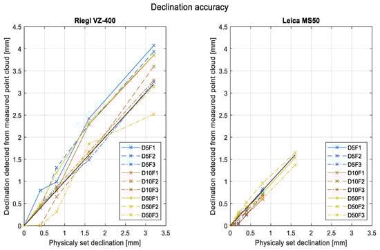 For this test, the board was scanned 10 times with both instruments in the initial position. Then, the board was tilted by a chosen value and scanned 10 times again (for the experimental setup, see Figure 4). The declinations increased until a significant change of the plane was observed.