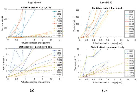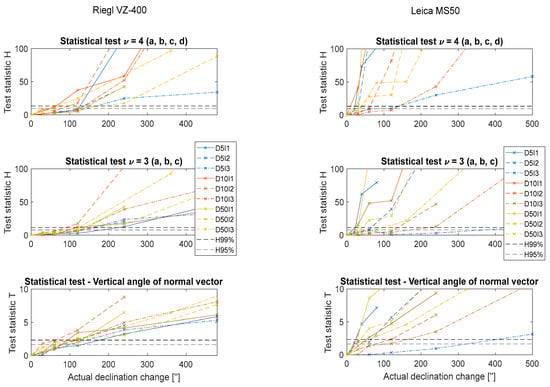 Results of the statistical tests for: (a) Riegl VZ-400; (b) Leica MS50. Blue lines indicate a distance of 5 m, red lines indicate a distance of 10 m, and yellow lines indicate a distance of 50 m. A full line corresponds to a small incidence angle (I1~0°), a dashed line to an intermediate incidence angle (I2~45°), and a dotted line to large incidence angles (I3~75°). The X axis represents the actual physical declination of the plane and the Y axis represents the values of the test statistics (Equation (5)). The horizontal dashed lines represent the critical values for confidence levels of 95% and 99%.