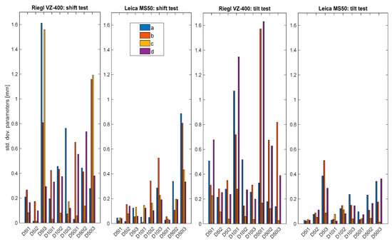 The average dispersion of individual parameters for all setups offered further insight into the precision of the plane parameters obtained by laser scanning. Ten repetitions in each position were performed using Riegl VZ-400 and five repetitions were used for Leica MS50. The numerical values for the precisions of computed parameters for both instruments are listed in Table 4 for the tilt test and in Table 5 for the shift test.