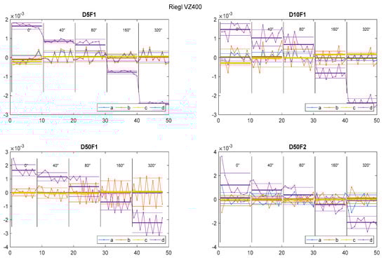 Figure 11 shows the start-up effects of Riegl VZ-400, which occurred often during the initial minutes of our test scanning. The dispersion of parameters in the first five to ten repetitions seemed to be significantly larger than those from later in the test. Therefore, we recommend that users warm up their scanners via idle scanning for a few minutes before beginning the process of scanning for real structural monitoring.