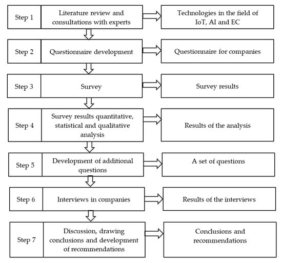Figure 1 presents the research methodology, consisting of seven steps. The first step was related to the preparation of the research, where a literature review (as presented in Section 2) and consultations with experts to develop survey questions were conducted. In the next step, a questionnaire was developed and shared with industrial companies. Then, the obtained answers were analyzed quantitatively and qualitatively. Based on the analysis results, a set of questions was developed and then used in interviews with industry representatives. Finally, based on the research results, conclusions were drawn regarding the needs of the industry, and recommendations were proposed.