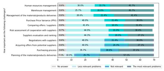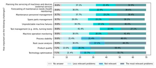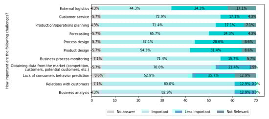 The performed literature review was insufficient to develop the survey questions on its own because, as shown in Table 1, there are some cells empty. The identified challenges did not cover all problems known to the authors from the experience of working closely with the industry. Besides, the internal firm perspective had to be considered in addition to the research community’s publications because many of them are theoretical and have little practical use. Therefore, consultations with experts were performed to prepare the survey questions. The purpose of consultations with experts was to evaluate selected topics regarding their importance for enterprises.