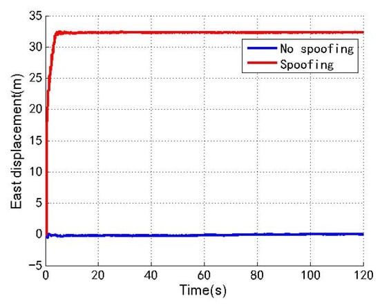 As shown in Figure 3, Figure 4 and Figure 5, when the loosely coupled system is spoofed by slowly varying spoofing, the north displacement gradually shifts by 29.8 m in the period of 0–66 s, and stabilizes around 29.8 m in the period of 66–120 s; in the 0–15 s period, eastward displacement gradually shifts by 32.3 m, and in the 15–120 s period, the eastward displacement is stable around 32.3 m; in the period of 0–66 s, down displacement gradually deviates by 43.2 m; and in the period of 66–120 s, down displacement is stable around 43.2 m. In terms of the spoofing effect, the north displacement basically achieves a spoofing effect, and the error between the north displacement and expected offset is −0.2 m; the east displacement basically achieves a spoofing effect, and the error between the east displacement and expected displacement is 2.3 m; the down ground displacement also basically achieves a spoofing effect, but the effect is slightly worse than that in the north and east directions, and the error with the expected offset is 13.2 m.