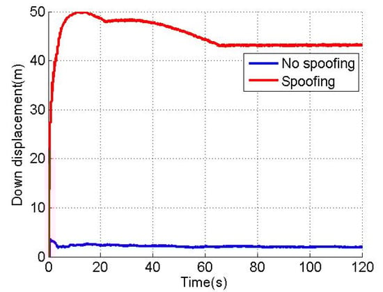 Figure 3, Figure 4 and Figure 5 show the north, east and down position offsets of the loosely coupled GNSS/IMU system without spoofing and with spoofing, respectively. The blue line indicates no spoofing, and the red line indicates spoofing.