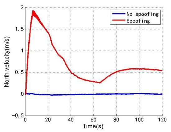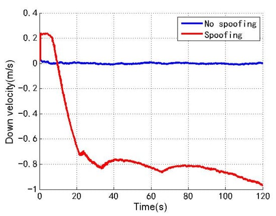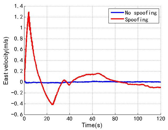 Figure 6, Figure 7 and Figure 8 show the north, east and down velocities of the loosely coupled GNSS/IMU system without spoofing and with spoofing, respectively. The blue line indicates no spoofing, and the red line indicates spoofing.