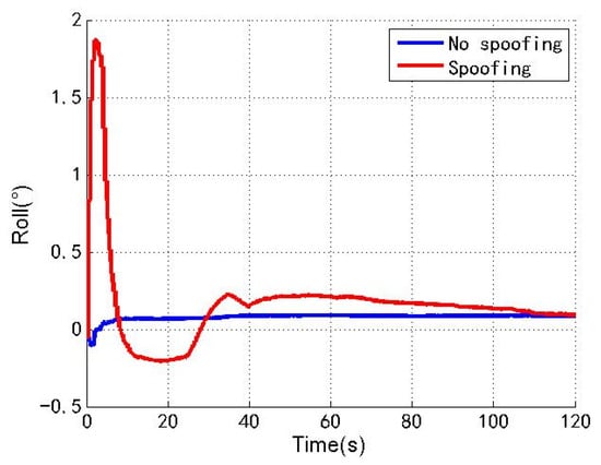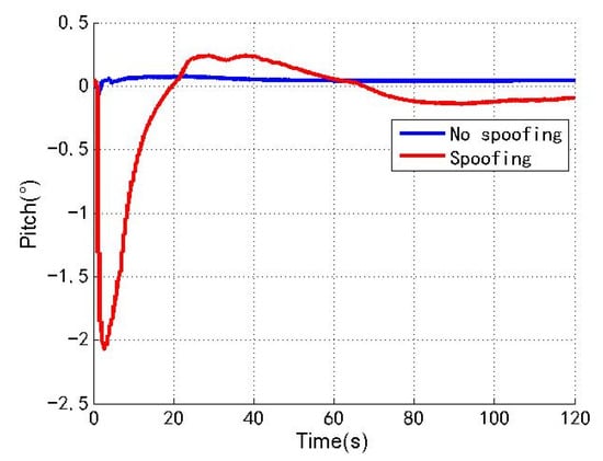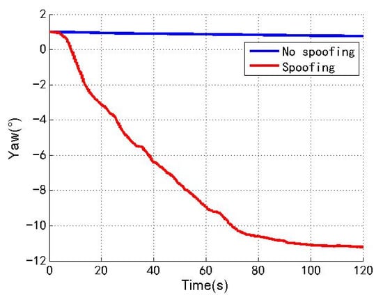 Figure 9, Figure 10 and Figure 11 show the changes of the roll angle, pitch angle and yaw angle of the loosely coupled GNSS/IMU system without spoofing and with spoofing, respectively. The blue line indicates no spoofing, and the red line indicates spoofing.